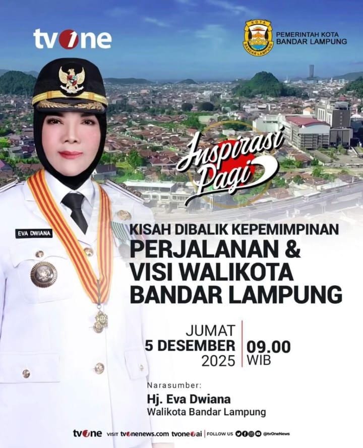 Bandar Lampung — Dalam program Inspirasi Pagi yang disiarkan oleh TvOne pada Jumat, 5 Desember 2025 pukul 09.00 WIB, Hj. Eva Dwiana, Walikota Bandar Lampung, hadir sebagai narasumber untuk membagikan kisah di balik kepemimpinannya.